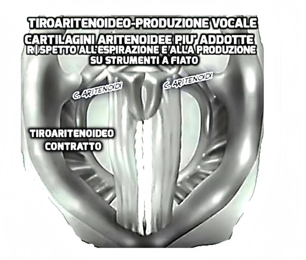 L’attività dei muscoli vocali rispetto a quella sola strumentale durante la produzione canora è caratterizzata da corde vocali non solo addotte ma aumentate anche in lunghezza su base antero-posteriore della loro posizione nella laringe, per azione cosciente su altri muscoli detti tiroaritenoidei, aritenoidei trasversi e obliqui.