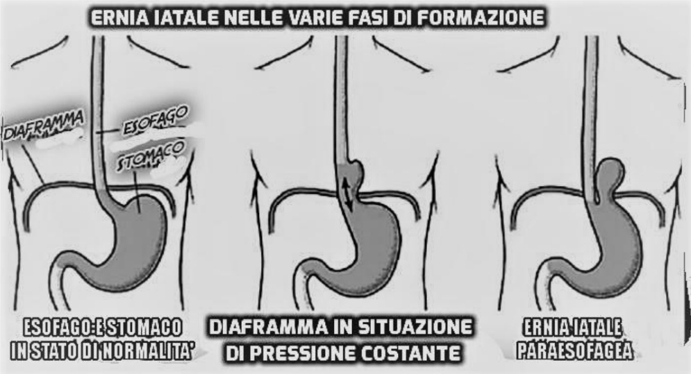 Un tipo di respirazione che tende generalmente a tenerlo bloccato verso il basso, in maniera tendenzialmente forzata, può generare la risalita del liquido gastrico sull’esofago, dando origine al reflusso. L’abbassamento costante del muscolo diaframmatico è di solito anche una delle cause principali dell’insorgere di ernia iatale, in quanto spingendo costantemente sullo stomaco va a tirare anche sull’esofago connesso a quest’ultimo. L’esofago resta comunque ancorato in alto perché legato alla colonna vertebrale, per cui la trazione dell’esofago verso l’alto provoca la risalita anche dello stomaco al di sopra del diaframma e quindi l’insorgenza di un’ernia iatale.
