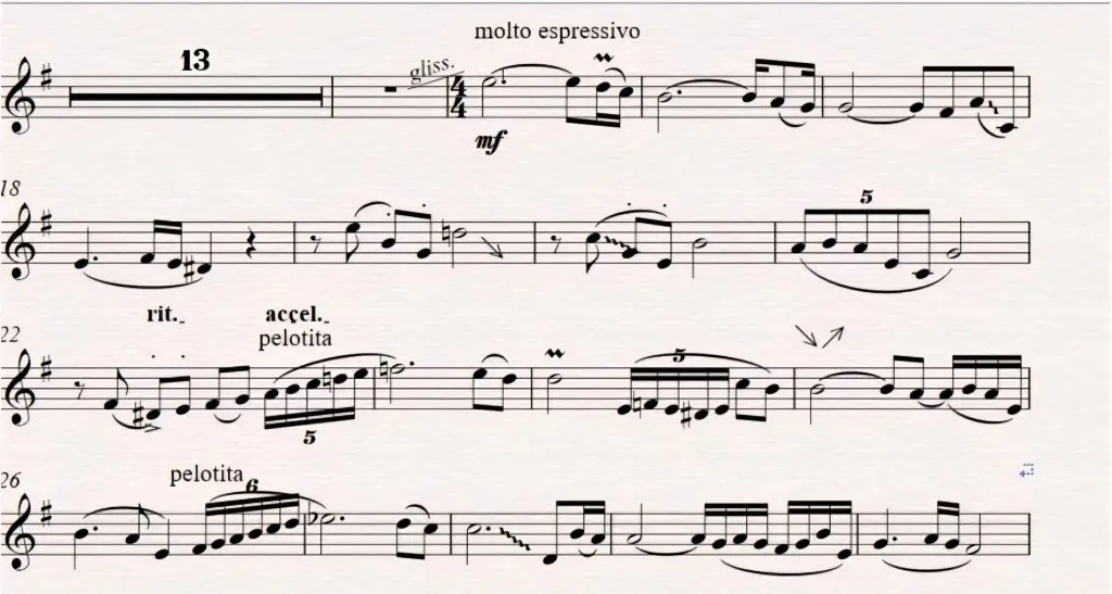 A lo largo del pasaje utilizo varias veces el recurso de jugar con la afinación, glissandos, barridas y agrego adornos.