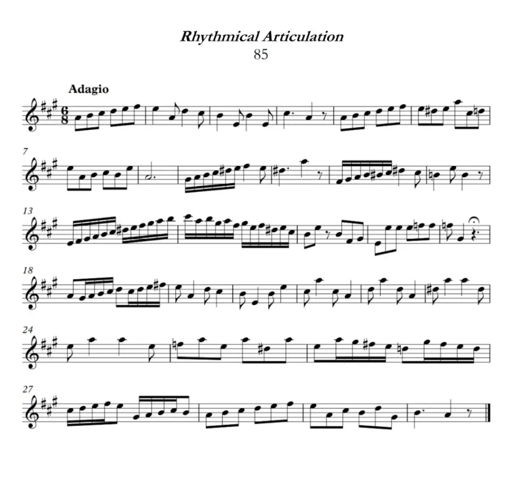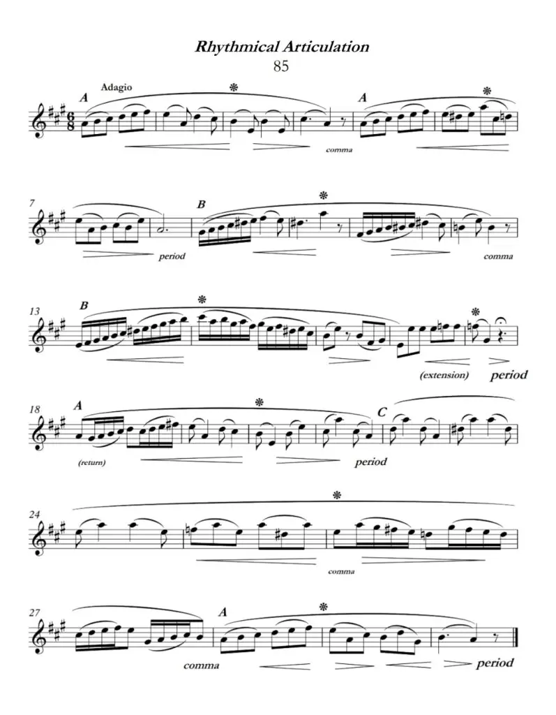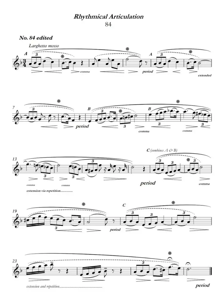 The following two etudes are taken from Pasquale Bona’s work titled, “Rhythmical Articulation”. Each etude is first presented as it was originally published and then it is presented with edits intended to convey phrase shapes, phrase differences, and returning phrases, as well as the degrees of closure between the phrases.