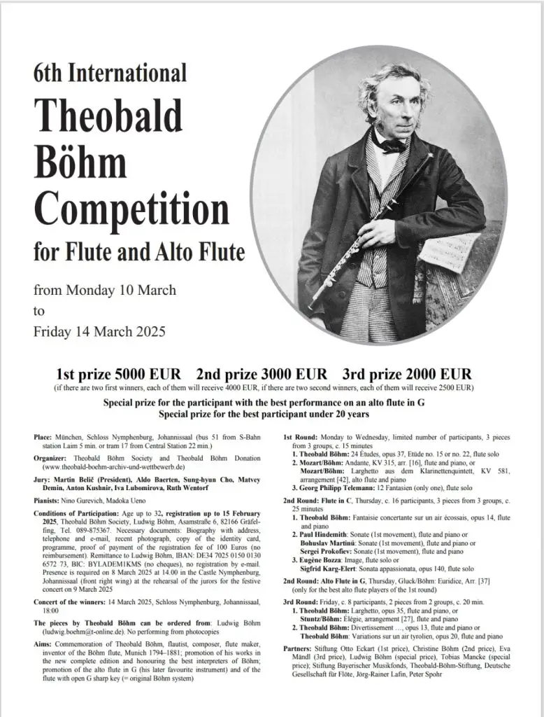 The countdown has begun for the highly anticipated 6th International Theobald Böhm Competition for Flute and Alto Flute, set to take place from March 10-14, 2025, in the stunning Schloss Nymphenburg, Johannissaal, Munich.