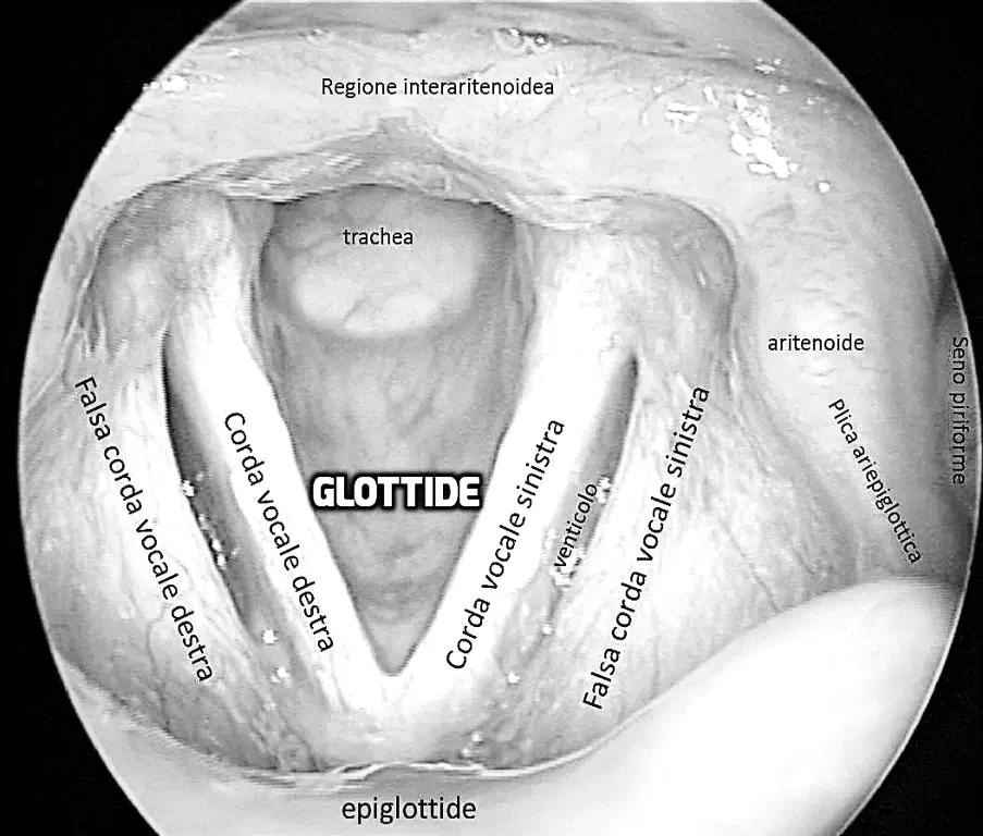 La laringe è un organo mobile molto complesso che si colloca al centro del collo, li si trovano le corde vocali che studieremo in maniera più approfondita nel corso del nostro manuale. Ci soffermeremo per ora alla loro osservazione, focalizzando l’attenzione su una zona precisa detta “Glottide”, da non confondere con il termine che usiamo per indicare le zone di restrizione negative dell’aria che utilizziamo per produrre il suono dal nostro flauto e dagli strumenti a fiato, ossia la gola.